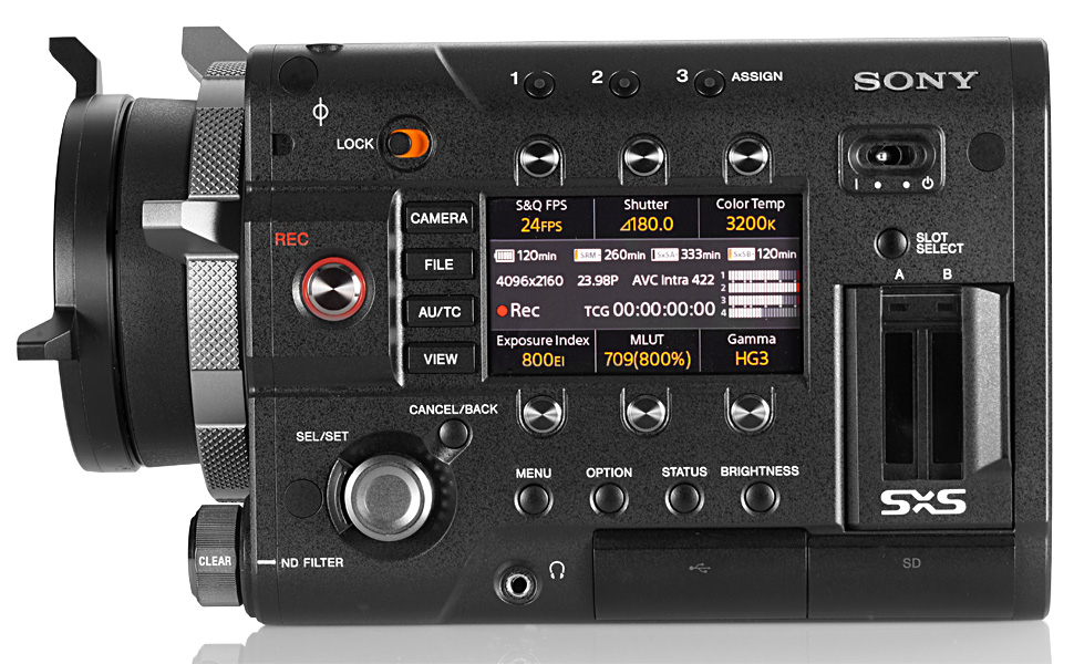 Der äußerlich identische Body von F/F55 ist etwas kompakter als bei der F3, es gibt aber etwa auch keinen fest am Body montierten Ausklappschirm. Im Body befinden sich zwei SxS-Slots für die Onboard-Aufzeichnung auf entsprechende Speichermedien. Für die Aufzeichnung stehen verschiedene Codecs zur Auwahl, von HD bis zu 4K, wobei letzteres die jüngste Generation von SxS-Speichermedien erfordert, die ebenfalls zeitgleich vorgestellt wird: SxS-Pro+.