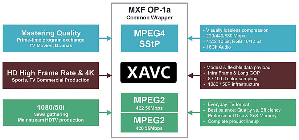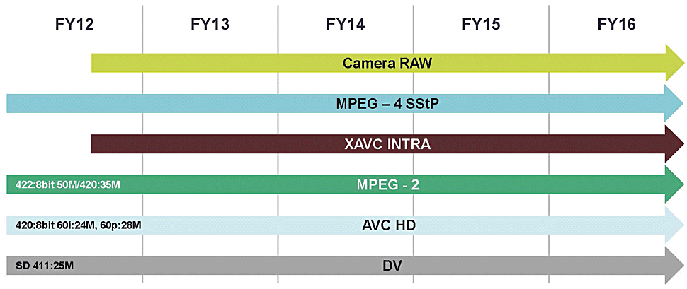 Unterhalb von XAVC siedelt Sony MPEG-2 422 mit 50 Mbps und MPEG-2 420 mit 35 Mbps an: besser bekannt als XDCAM HD 422 und XDCAM EX. Gleichzeitig versichert Sony, dass XAVC die MPEG-basierten Formate im eigenen Portfolio nicht ablösen werde: Nur in diesen Formaten werde es bis auf absehbare Zeit ein komplettes Line-Up vom Schultercamcorder bis zum Handheld auf Disc- und SxS-Basis geben. Insgesamt betrachtet, werde man bis mindestens zum Geschäftsjahr 2016 alle bestehenden Formate weiterführen — sogar bis hinunter zu DV.