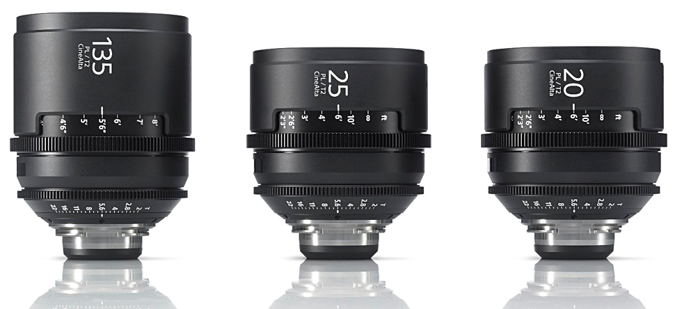 Zu den neuen Kameras passende PL-Objektive aus eigenem Haus bietet Sony in Form eines Dreier- und eines Sechser-Sets an. Zusätzlich zu den von der F3 bekannten Festbrennweiten mit 35, 50 und 85 mm Brennweite (Dreier-Set: SCL-PK3), kommen parallel zu den neuen Kameras weitere Primes mit den Brennweiten 20, 25 und 135 mm in den Handel (Sechser-Set: SCL-PK6). Alle erreichen eine maximale Öffnung von T2.0, sind für 4K-Auflösung gerechnet und bieten ein Metallgehäuse.