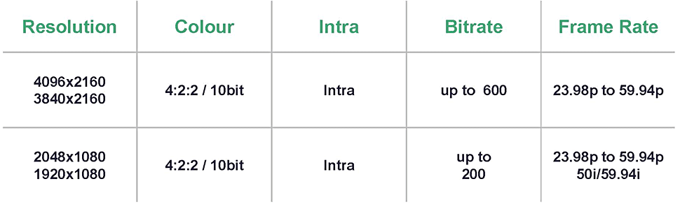 XAVC wird zunächst die Raster 4.096 x 2.160, 3.840 x 2.160 sowie 2.048 x 1.080 und 1.920 x 1.080 bieten. Die 4K-Raster werden in 4:2:2 mit 10 Bit per Intraframe-Kodierung komprimiert, die Datenrate kann bis zu 600 Mbps betragen, die Bildrate 23,98 bis 59,94 Hz in progressiver Bildfolge. Auch das 2K- und das Full-HD-Raster werden die Farbinformation in Form von 4:2:2/10-Bit-Signalen verarbeiten, die intraframe-kodiert werden. Die Datenrate ist bei diesen niedrigeren Rastern auf maximal 200 Mbps limitiert, als Bildraten stehen 23,98 bis 59,94 Hz in progressiver Bildfolge und zusätzlich 50i und 59,94i zur Verfügung.