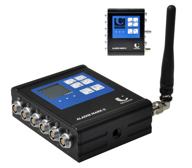 Aladin MK II von Chrosziel ist eine Funk-Objektivfernsteuerung und besteht aus einer Empfänger-/Steuereinheit sowie einem modular aufgebauten Handgerät. Die Empfängereinheit erlaubt die gleichzeitige Steuerung von bis zu acht Stellmotoren und ist somit auch für den Betrieb in einem Stereo-3D-Setup geeignet. Hier können dann für beide Objektive synchron Fokus, Blende und Zoom sowie Konvergenz und Abstand der beiden Kameras gesteuert werden. Aladin MK II ist mit den meisten Motoren wie etwa dem Preston DM2 kompatibel. Neben 8 Motor-Controllern verfügt die Steuereinheit auch über zwei serielle Schnittstellen, die sich je nach Bedarf konfigurieren lassen – beispielsweise für die oben beschriebene Steuerung der Fujinon-Optik. Aladin MK II kann über die serielle Schnittstelle auch Canon-Digitalobjektive direkt ansteuern. Eine USB-Schnittstelle dient zum Aufspielen von Software-Updates, kann aber auch zur Aufzeichnung von Metadaten genutzt werden. Die verbaute Start / Stopp-Buchse erlaubt zudem das ferngesteuerte Aktivieren einer Aufnahme, sofern das Kameramodell unterstützt wird und passende Kabel verfügbar sind.
