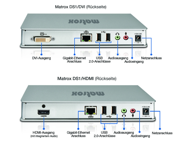 Von der Dockingstation stehen zwei Versionen zur Verfügung: eine für dem Einsatz mit DVI-Monitoren, eine andere zur Verwendung mit HDMI-Monitoren. Matrox DS1/DVI und Matrox DS1/HDMI sind ab sofort zum Netto-Listenpreis von rund 250 US-Dollar in Nord- und Südamerika verfügbar. Die weltweite Verfügbarkeit soll noch im Januar 2013 folgen.