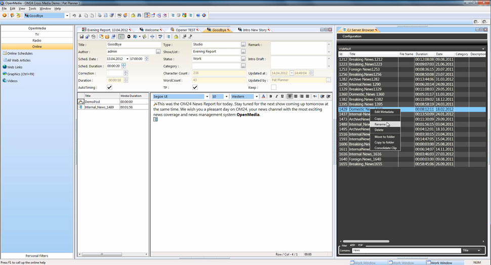 ClipJockey Server arbeitet mit gängigen Newsroom-Lösungen wie beispielsweise Annova Systems Open Media, Avid iNews, AP ENPS oder Octopus zusammen. Die Software installiert sich als ActiveX-Komponente in die vorhandene Newsroom-Umgebung und soll sich so nahtlos in bestehende Workflows integrieren. Einmal installiert, kann mit Hilfe von ClipJockey Server auf die angebundenen Videoserver zugegriffen werden. Der auf dem Videoserver liegende Content lässt sich dann in einen Ablaufplan bzw. Rundown einordnen, um so das Playout der gewünschten Clips zu organisieren. Eine Übersichtsfunktion zeigt zudem alle auf dem Server vorhandenen Videos an. Arvato Systems betont die Anwenderfreundlichkeit seiner Software: Funktionen wie »Drag and Drop« oder »Auto-Update« ermöglichen eine intuitive und übersichtliche Bedienung. ClipJockey Server kann im 24/7-Betrieb genutzt werden.