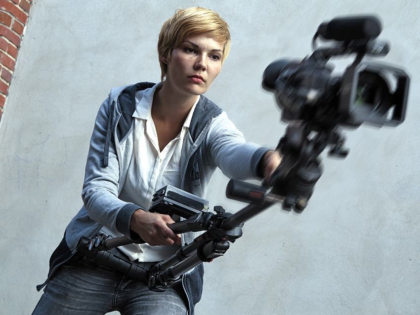 Um seine Wirkung zu entfalten, benötigt Hipjib lediglich ein normales Stativ mit Videokopf. Hipjib lässt das Stativ weich und sicher vor dem Kameramann schweben, so Gerd Wagner. Damit eröffnet sich ein weiter Aktionsradius vom Boden bis weit über den Kopf, wie er sonst nur mit einem aufwändigen Jib-Arm möglich wäre. Gleichzeitig vermittelt das System die Stabilität einer Schulterstütze, sagt Gerd Wagner. Mit einem Klick wird Hipjib am Körper befestigt und das Stativ mit der Kamera darin verankert.