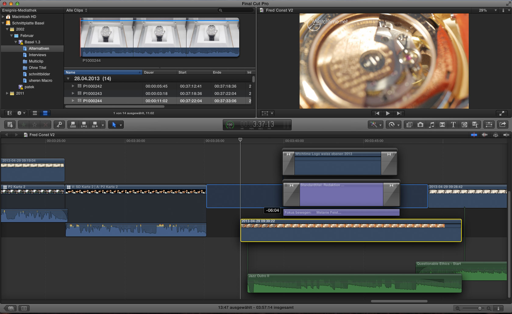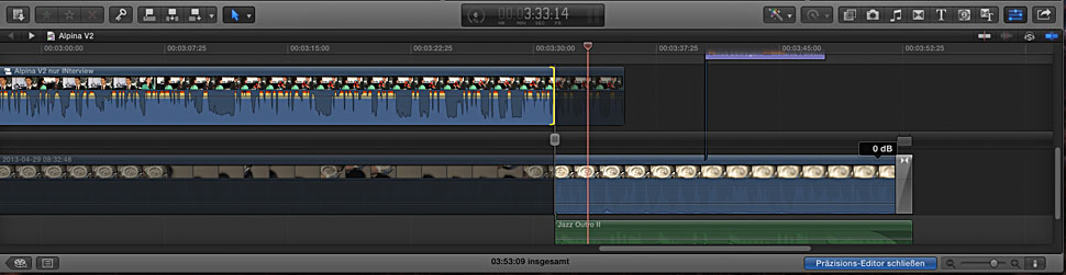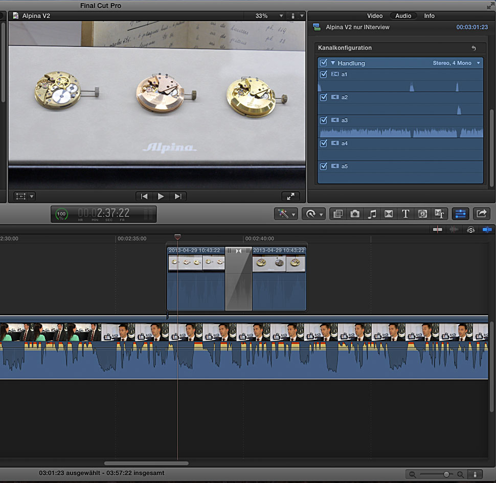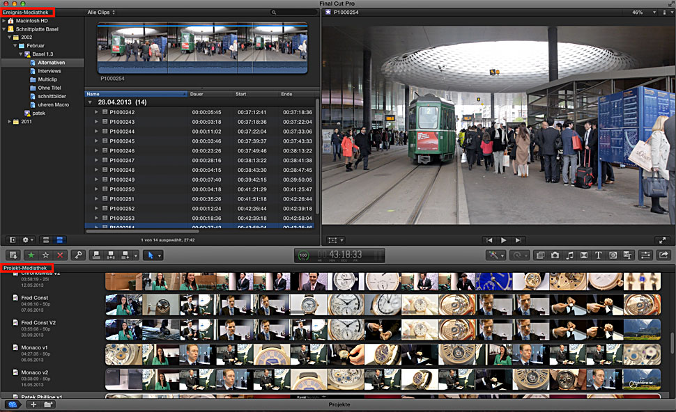 Lässt man diese Einstiegshürde außer acht, präsentiert sich FCP X trotzdem als professionelles Schnittprogramm. Mit den jüngsten Updates sind nun alle Werkzeuge vorhanden, die ein Editor benötigt, um einen Film in professioneller Weise zu schneiden und dabei auch schnell und effizient arbeiten zu können. Das ist die Königstugend für ein professionelles Schnittprogramm, mit dessen Einsatz der Anwender Geld verdienen will. Ein Großteil der Editoren verbringt die meiste Zeit mit Sichtung und Organisation des Materials und dann mit Hartschnitten, Trimmen, Inserts, sowie etwas Tonbearbeitung, Farbkorrektur — und hie und da wird noch eine Blende oder ein Bild-im-Bild-Effekt eingebaut.