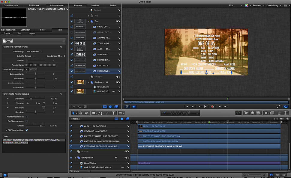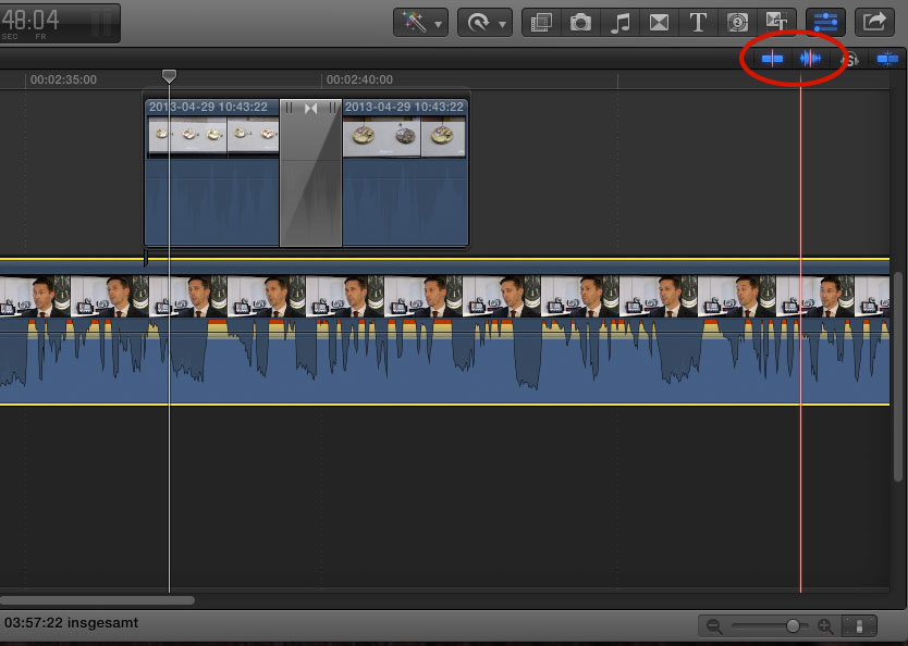 - Es gibt bei FCP X keine klassischen, für sich allein stehenden Spuren, sondern eine zentrale Spur — »Handlung« genannt — an die alle anderen Ebenen angedockt werden müssen.