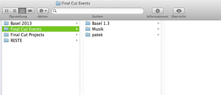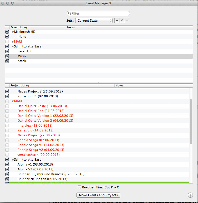 - Die nicht benötigten Ereignisse und Projekte werden vor dem Start in einen anderen Order auf derselben Festplatte verschoben – beispielsweise »Andere Ereignisse« und »Andere Projekte«. Diese können dann immer wieder zurück verschoben werden, wenn sie benötigt werden.