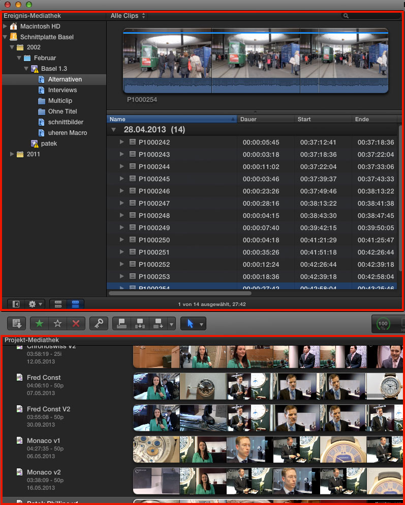 Eine weitere Hürde beim Umstieg auf FCP X ist — neben der Nomenklatur und den bisher genannten Aspekten — das Dateimanagement. FCP X organisiert Projekte nach einem eigenen, neuen System und lässt die gewohnten Drag-and-Drop-Abläufe nicht zu. Zudem arbeitet FCP X — wie schon erwähnt — mit Bezeichnungen, die zum Großteil aus iMovie stammen und deshalb viele Profi-Cutter erst einmal abschrecken. Bisher war bei FCP 7 das »Projekt« einfach eine Sammlung aller Daten und Sequenzen in einem Browser-Fenster — jetzt bei FCP X, versteht Apple darunter das, was früher »Sequenz« hieß: Eine Timeline, in der Clips zum finalen Film angeordnet werden. Das frühere »Projekt« hingegen heißt nun »Ereignis« und speichert zwar die Clips und Daten, nicht aber die Sequenzen, die ja nun »Projekte« heißen. Alles klar?