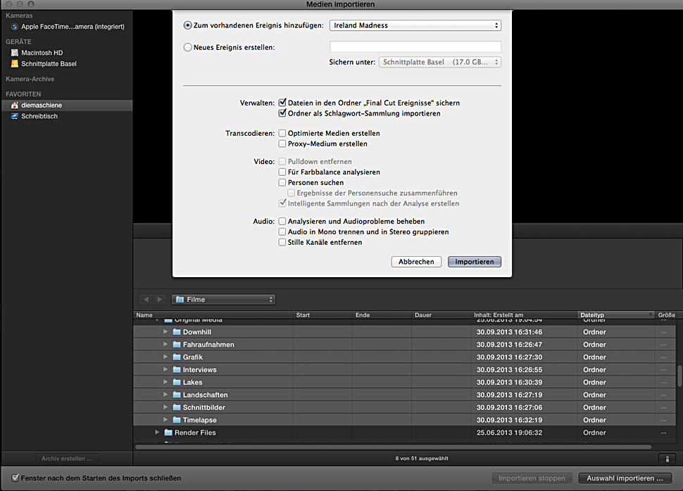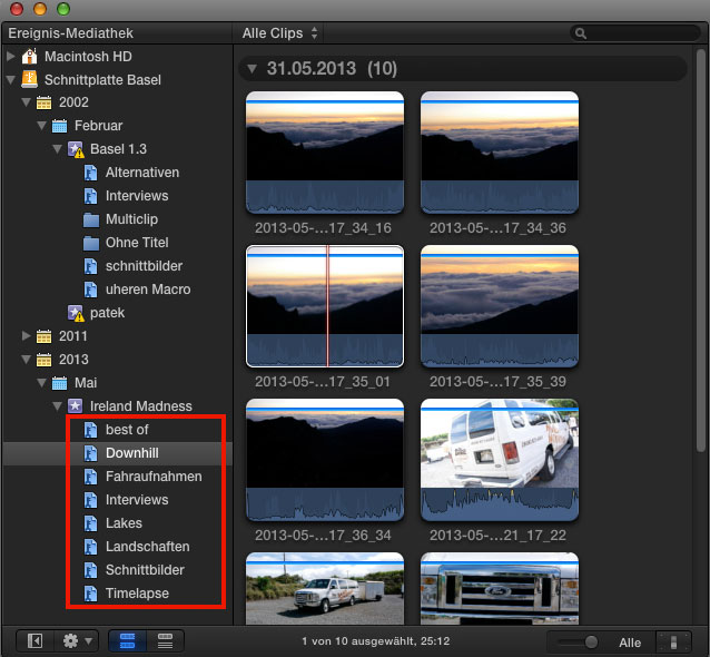 Wer die Daten lieber selber verwalten und ordnen will, für den ist das Datei-Management von Final Cut Pro X störrisch wie ein Esel. Einfacher ist es, wenn man sich dem System unterordnet, das Apple ersonnen hat. Aber auch dabei gibt es Fallstricke: Die Daten lassen sich beim Import analysieren und werden dann automatisch in verschiedene Unterkategorien aufgeteilt. Dabei kann ein Clip oft auch in mehreren Kategorien vorkommen. Das geht gut, solange es nur wenig Kamerabewegungen oder Zoomfahrten gibt. Bei Aufzeichnungen im MTV-Style erhält man jedoch schnell einem Haufen von Ordnern, die genau das Gegenteil dessen bewirken, was sie sollen: Sie schaffen keine Ordnung, sondern Chaos.