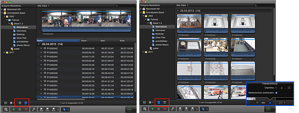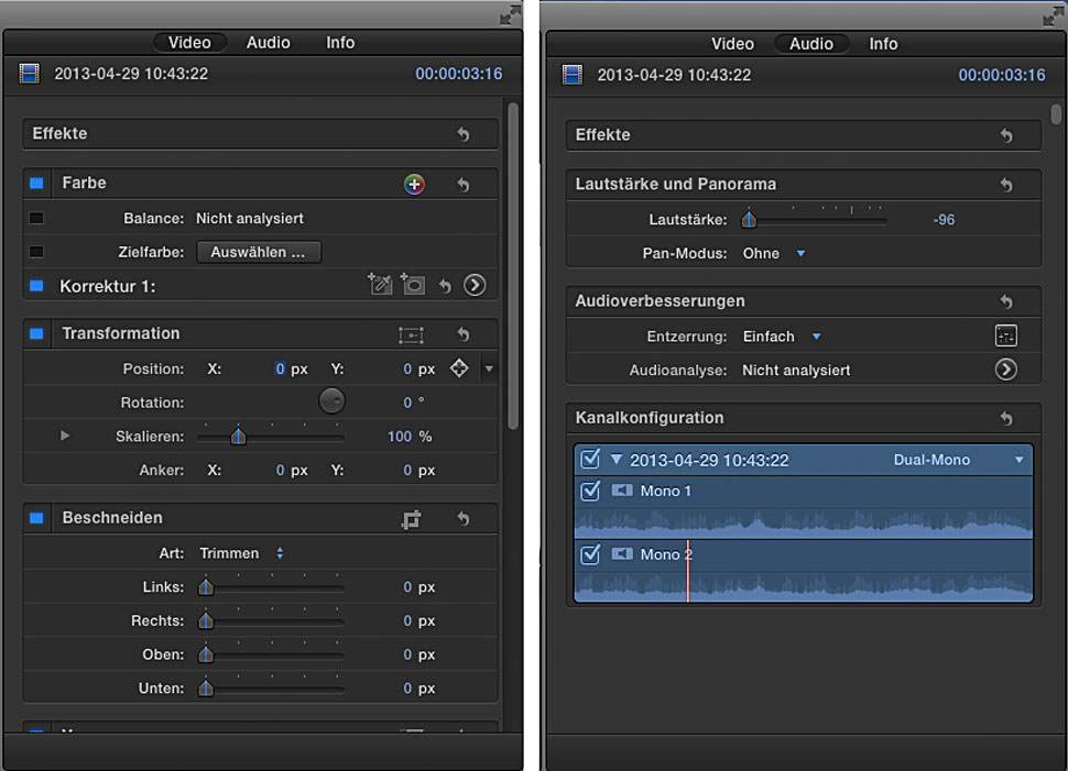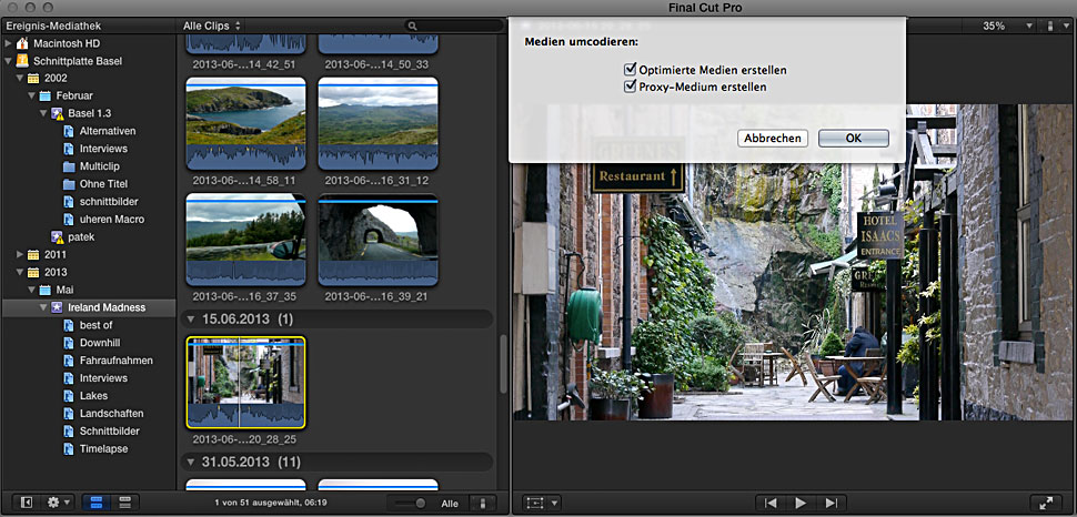 Die Handhabung von Proxy-Video und »optimierten Medien« ist im Vergleich zu FCP 7 stark vereinfacht. So kann während des Imports eine ProRes-Proxy und eine ProRes-422-Kopie (= optimierte Medien) angelegt werden. Wenn es die (mangelnde) Performance des Rechners erfordert, werden dann die Proxy-Dateien verwendet. Beim Export wird dann automatisch wieder das beste Medienformat verwendet. Das Handling der Dateien findet also im Hintergrund statt, ohne dass sich der Cutter darum kümmern müsste. Wichtig ist lediglich, einzustellen, ob bei der Wiedergabe Leistung oder Qualität wichtiger ist. Wer dies beim Import vergessen hat, kann es im Ereignis-Browser nachholen: Per Rechtsklick und mit der Option »Medien Umkodieren« lässt sich wahlweise »Optimiert« oder »Proxy« auswählen. In welchem Format eine Datei vorhanden ist, kann man im Informationsfenster im Tab »Info« unter dem Punkt »Verfügbare Vertretungen für Medien« ablesen.