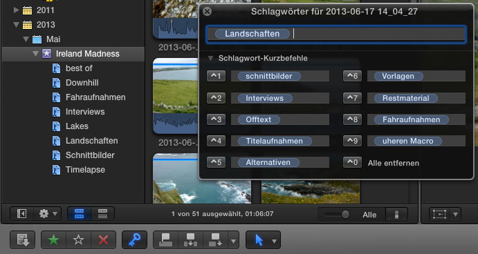 - Die zweite manuelle Möglichkeit ist die Projektorganisation mit Hilfe des Schlagwort-Editors. Damit lassen sich bis zu neun Schlagwort-Kurzbefehle anlegen. Wird ein Clip mit einem der Schlagwörter versehen, taucht er im Ordner der entsprechenden Schlagwortsammlung auf. Der Browser kennt zwar auch normale Ordner, aber hier lassen sich nur Schlagwortsammlungen organisieren. Clips können nicht per Drag-and-Drop in einen Ordner verschoben werden.