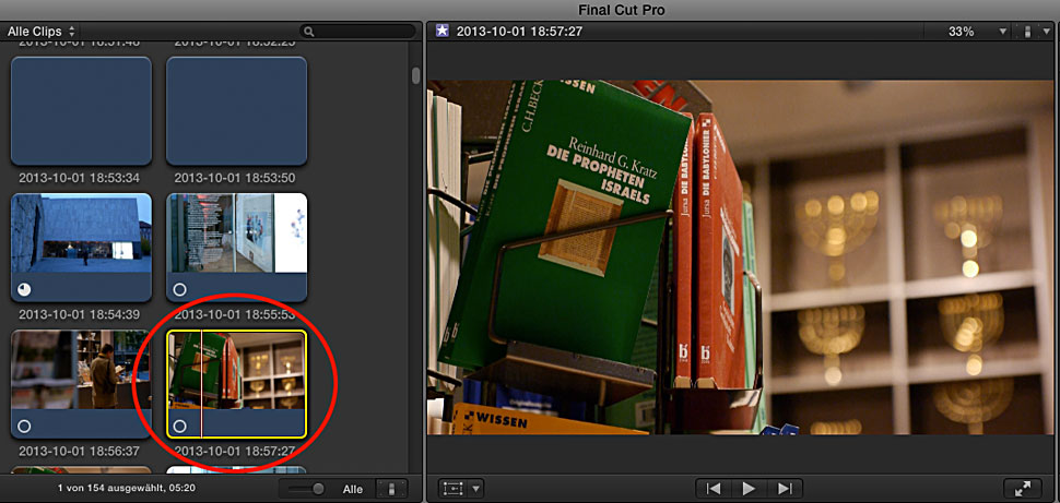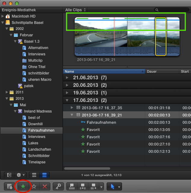 Die F-Taste legt einen Favoriten fest und markiert dabei einen Bereich des Clips. Das klassische »Find Frame«-Kommando, um genau diesen Clip in den Viewer zu laden, das bisher mit dieser Taste verbunden war, ist überflüssig geworden, da Viewer und Browser im Ereignis-Fenster verschmolzen sind. Mit »Umschalt + F« wird wie auch bisher der Originalclip in der Ereignis-Mediathek geöffnet. Gerade wenn viele Ereignisse offen sind, ist das auch der einfachste Weg, um das richtige Ereignis wieder zu finden.
