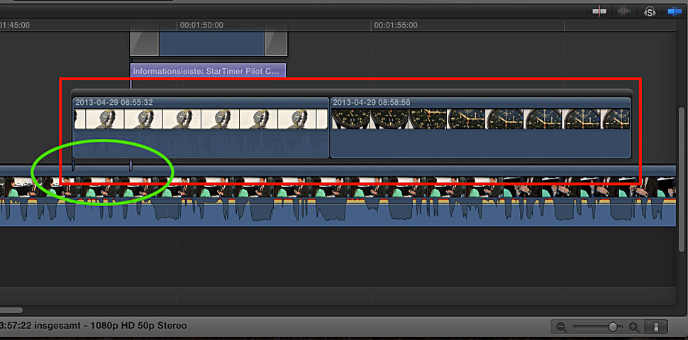 An vielen anderen Stellen bietet FCP X eine wesentlich schnellere Arbeitsumgebung. Ein Beispiel dafür ist der Skimmer. FCP X unterscheidet zwischen Abspielposition und Skimmer. Der Skimmer (S-Taste) ist eine vertikale rote Linie in der Timeline, die automatisch mit der Maus mitwandert, ohne dass man in die Timeline oder das Videofenster klicken müsste. Die Abspielposition springt zum Skimmer, wenn in den entsprechenden Bereich geklickt wird.