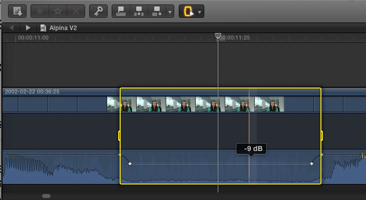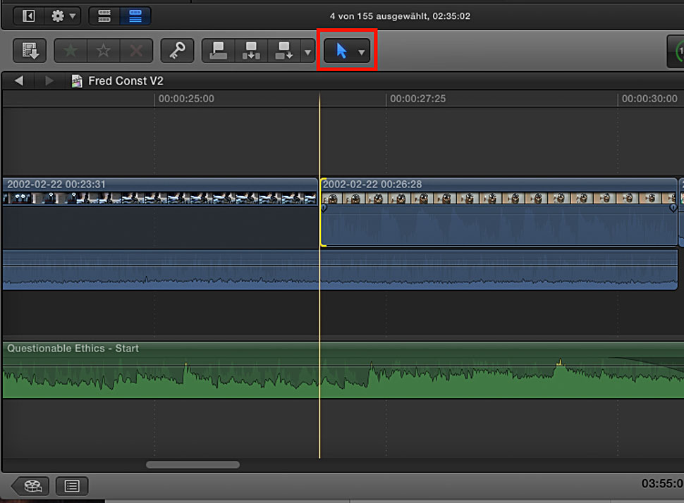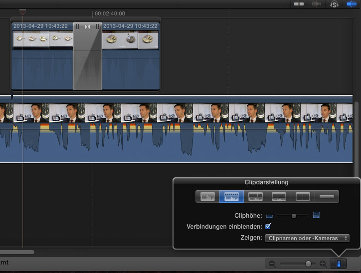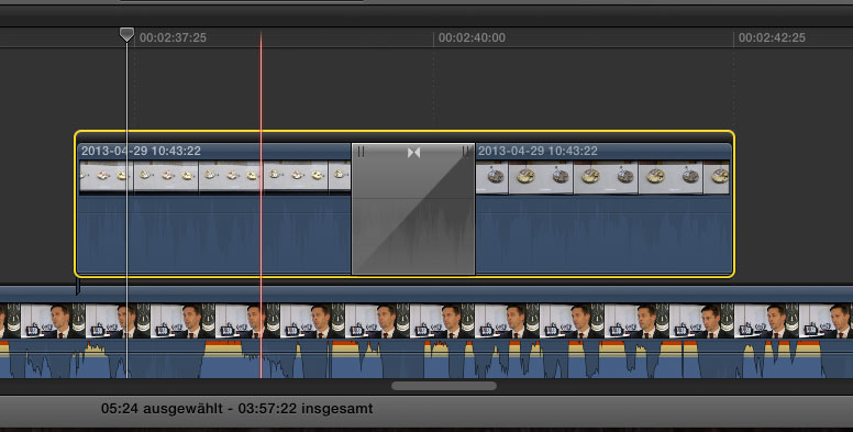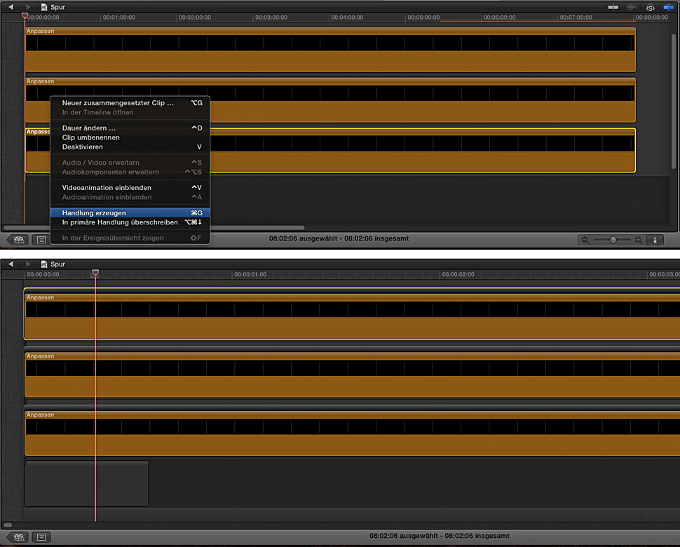 Angehängte Clips oder Handlungen hängen mit kleinen Verbindungen an der Haupthandlung. Sie lassen sich auch verschieben, wenn beispielsweise der Clip in der Haupthandlung gelöscht werden soll. Das ist zwar simpel, aber etwas fummelig zu bedienen. Mit gedrückter Befehl + Wahl-Taste klickt man dazu auf den Clip, dann springt der Anker an diese Stelle (Bei Handlungen ist wichtig, dass in den schwarzen Rahmen geklickt wird).