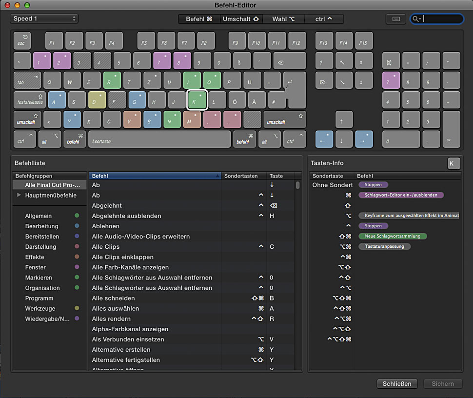 Die Tastaturbefehle aus FCP 7 lassen sich leider nicht in FCP X importieren. Der Editor muss sich zunächst also die Mühe machen, eigene Kommandos festzulegen oder die neuen zu lernen und seine eigenen Modifikationen zu speichern