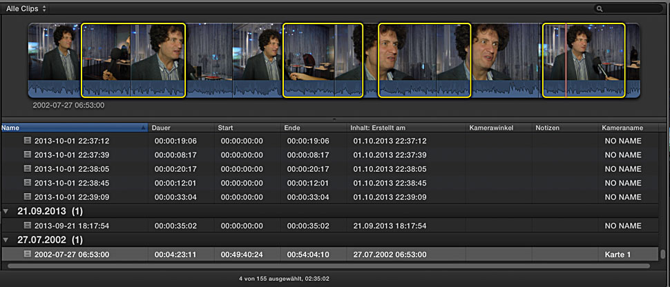 In der Praxis hat sich vor allem ein neues Feature von FCP X als sehr praktisch herausgestellt: Es können mehrere In- und Out- Punkte in einem Clip gekennzeichnet werden. Sie bleiben im Ereignis-Browser erhalten, solange sie sich nicht überschneiden. Allerdings sind die vorgegebenen Tastaturkommandos für alternative Anfangs- und Endpunkte mit »Umschalt + Befehl + I (oder O)« zu umständlich. Stattdessen ist die Tastenkombination »Wahl + I« oder »Wahl + O« wesentlich praktischer. Sie ist ursprünglich für das Löschen beider Punkte gedacht, was man eher seltener benötigt. Die Option, mehrere In- und Outpunkte in einem Clip zu setzen, ist sehr hilfreich, um bei längeren Aufnahmen Ordnung zu schaffen, ohne dass man Subclips oder Marker verwendet. Später ist es dann möglich, einfach den gewünschten Bereich des Clips auszuwählen und mit einem der genannten Befehle in die Timeline einzufügen.