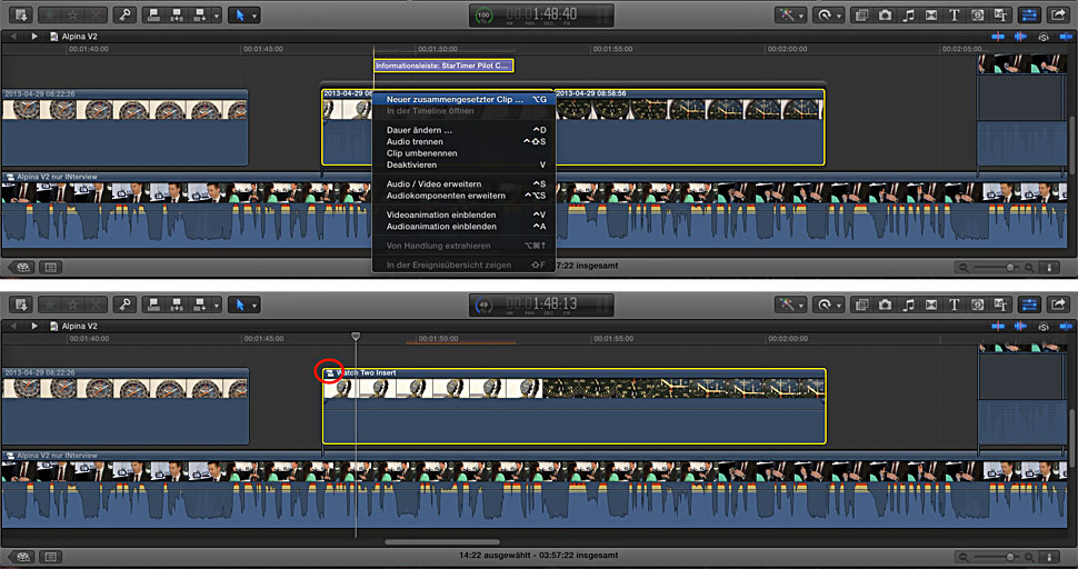 Beim Kopieren eines zusammengesetzten Clips über die Wahl-Taste oder per »Copy and Paste« wird nicht automatisch ein neuer zusammengesetzter Clip angelegt. Um ihn in der Ereignisübersicht zu duplizieren, muss mit Rechtsklick das Kommando »Neuer Zusammengesetzter Clip« in der Ereignis-Mediathek dupliziert und dann erneut eingesetzt werden. Bei Copy und Paste in der Timeline wird keine neue Sequenz angelegt, also verweisen alle »Zusammengesetzten Clips« auf denselben Titel. Zusammengesetzte Clips sind auch der einzige Weg, um getrennte Audio und Videoclips wieder zusammenzufügen. Mit dem Kommando Rechtsklick »Audio trennen« lässt sich in einem Projekt (Timeline) eine Audiodatei von einer Videodatei trennen. Der Nachteil: Sie lassen sich nicht wieder durch das Link-Kommando zusammenfügen, nur durch zusammengesetzte Clips, die bei häufiger Nutzung die Ereignis-Mediathek unnötig überladen.