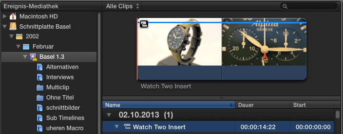 Mit »Umschalt + I« und »Umschalt + O« kann zwar innerhalb eines Bereichs gesprungen werden, aber leider nicht zur nächsten Bereichsauswahl. Falls keiner der ausgewählten Bereiche markiert ist, werden einfach alle markieren Clipbereiche in die Timeline eingefügt. Gerade bei dokumentarischen Formaten, bei denen es hauptsächlich auf die exakte Auswahl der Clips ankommt, ermöglicht diese Arbeitsweise eine hohe Arbeitsgeschwindigkeit. Klassische Subclips gibt es in FCP X nicht. Zwar kann die Favoriten-Funktion (F-Taste) dazu verwendet werden, mehrere Bereiche als gut zu markieren und die nicht markierten Bereich mit »Control + F« auszublenden, aber nicht in dem Umfang, wie das von klassischen Subclips her bekannt ist.