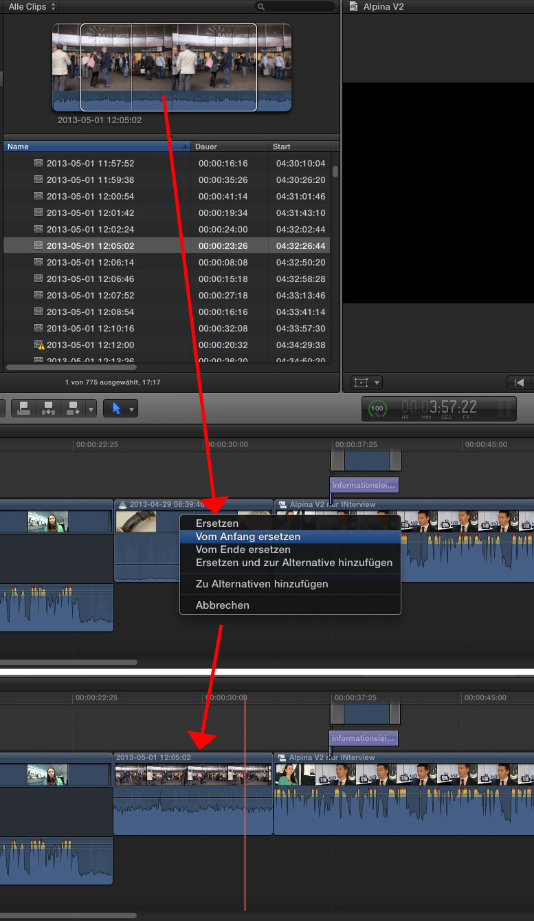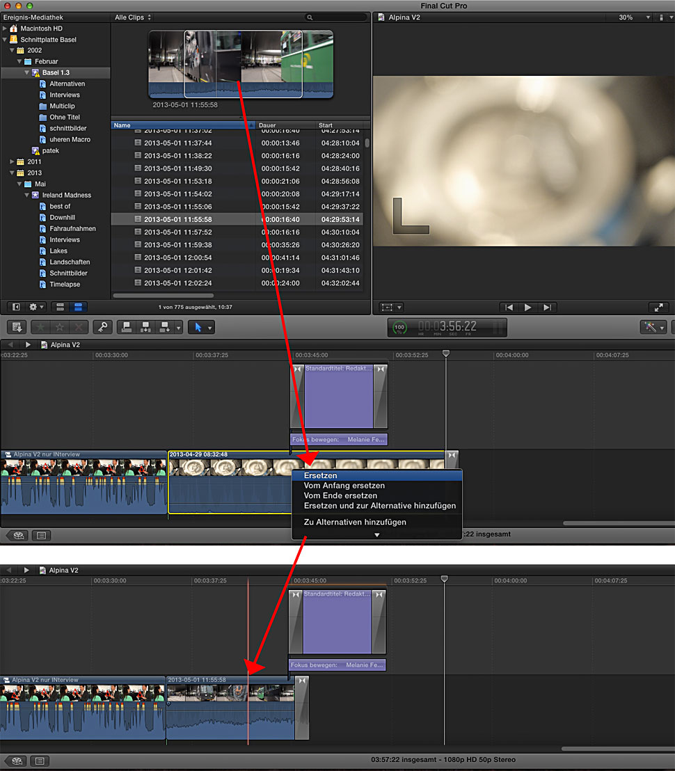 Für das Ersetzen gibt es in FCP X die Wahl zwischen drei Kommandos: