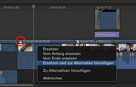 - Die Alternativen-Funktion (Umschalt + Y) ist eine Erweiterung des Ersetzen-Befehls. Dabei wird ebenfalls ein Clip durch einen anderen ersetzt, allerdings wird der alte Clip nicht gelöscht, sondern als unsichtbare Alternative mit dem neuen Clip verbunden. Auf diese Weise können mehrere Clips gestapelt und mit einem einfachen Klick ausgewechselt werden. Clips lassen sich auch duplizieren, um verschiedene Effekte ausprobieren zu können. Mit einem Klick auf die Frames kann zwischen den Alternativen gewechselt werden.