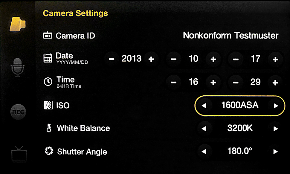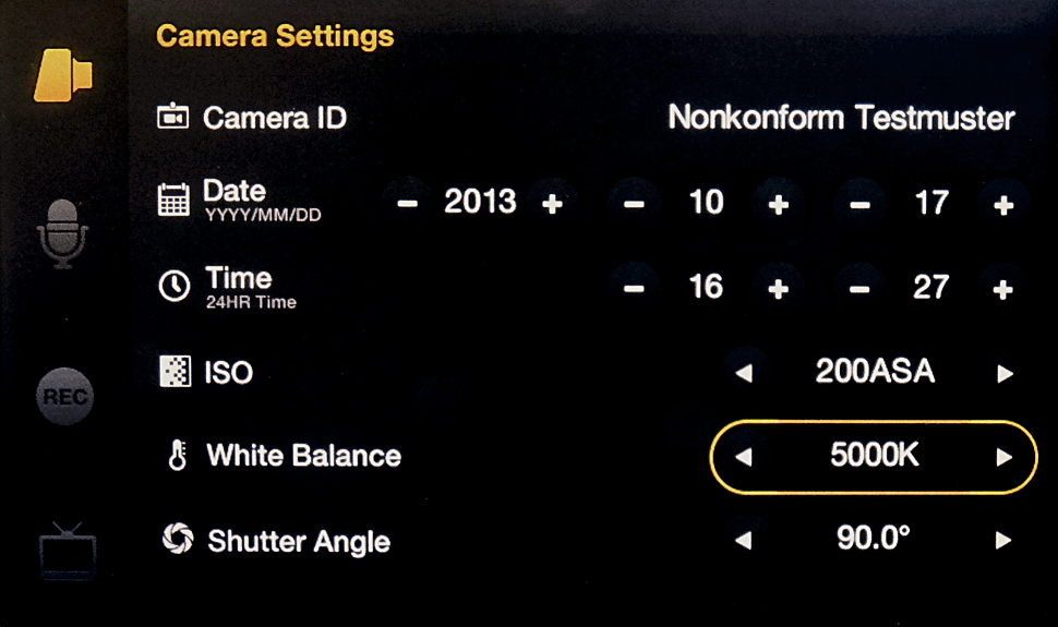 Das Menü ist übersichtlich, man muss nicht lange nach den Funktionen suchen, denn so viele einzelne Menüpunkte gibt es gar nicht. Die Menüeinteilung und Steuerung folgt weitestgehend dem, was man von Blackmagics Cinema Camera (BMCC) kennt (Test) — und hier liegt auch ein kleiner Kritikpunkt begraben: Anders als die größere BMCC hat die PCC keinen Touchscreen, was angesichts der viel kleineren Display-Größe sicher sinnvoll ist und viele Anwender ohnehin besser finden werden. Die Einstellung der PCC-Menüs erfolgt also per Cursor-Tastenfeld. Das läuft überwiegend gut, aber wenn es etwa um die Eingabe von Metadaten geht, passen Bedienung per Cursor-Tasten und das Bildschirmmenü nicht optimal zusammen: Es dauert ewig, bis man mit den Pfeiltasten auf der Bildschirmtastatur hin und her rangiert und etwas eingegeben hat.