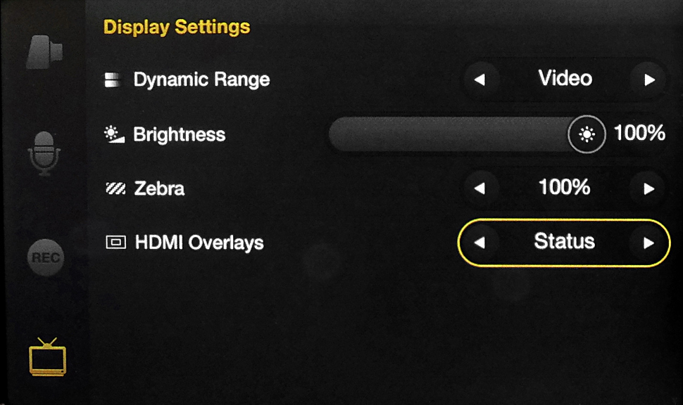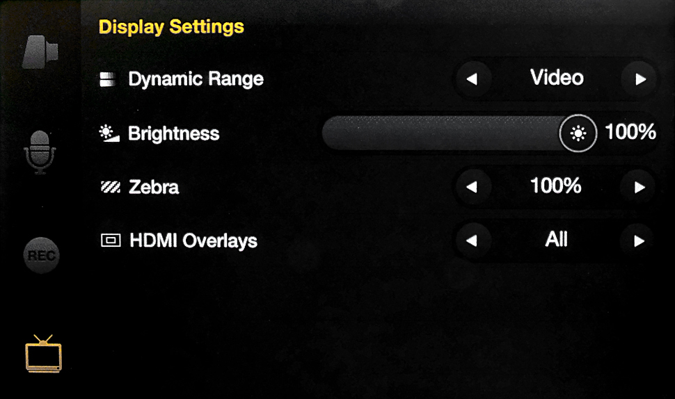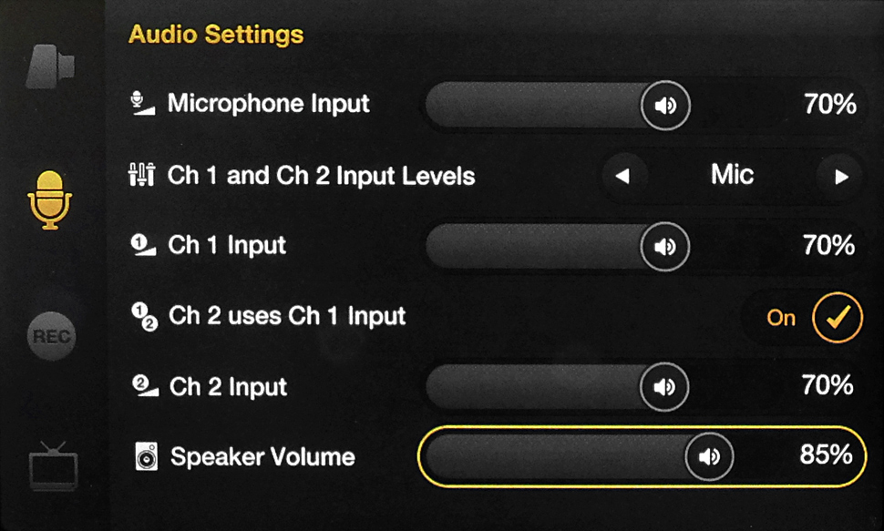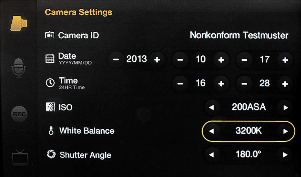 Dann gibt es auf der Geräterückseite noch die Einschalt- und die Menü-Taste, oben drauf den Auslöser und Tasten für die Wiedergabesteuerung — das war’s: keine User- oder sonstige Funktionstasten, alles weitere muss per Menü eingestellt werden. Zwar findet man im übersichtlichen Menü schnell Weißabgleich/Farbtemperatur, Shutter Angle, Zebra und die Einstellmöglichkeit für das Aufzeichnungsformat oder die Empfindlichkeit, aber man muss dafür eben stets in die Menüeinstellungen gehen. Das gilt auch für die Audioeinstellungen und den Audiopegel.