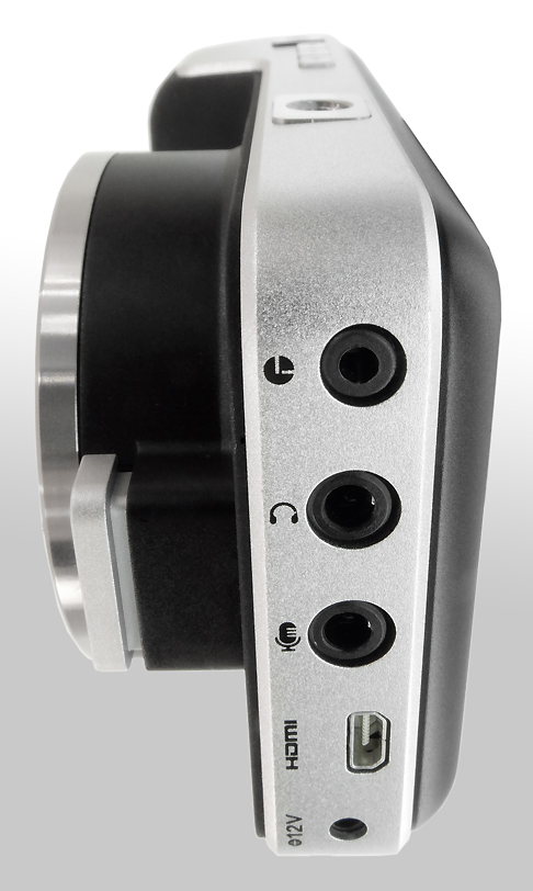 Auf der linken Seite des Gehäuses befinden sich die sichtbaren Anschlüsse, am Boden der Kamera sind hinter einer Klappe Akkufach, Speicherkarten-Slot und eine USB-Buchse versteckt. Oben und unten weist das Gehäuse ein jeweils ungefähr mittig angeordnetes 1/4-Zoll-Stativgewinde auf.