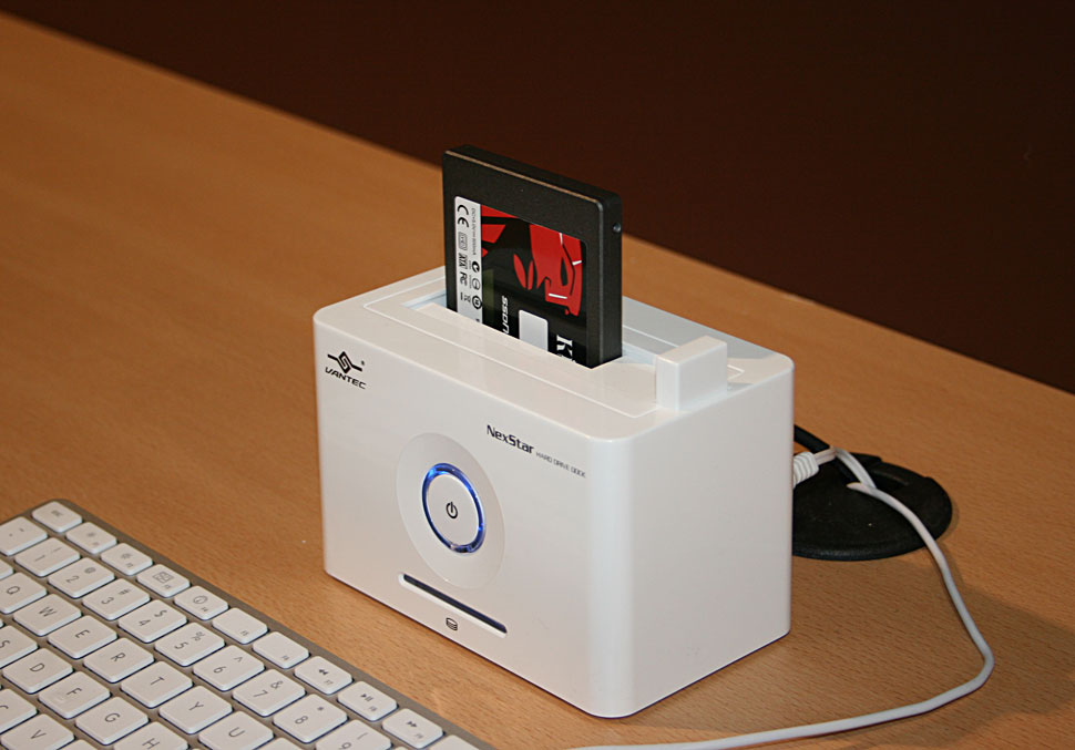 Für sämtliche Kopier-, Lösch- und Formatierungsvorgänge muss die SSD also über eine Docking-Station oder einen Festplattenadapter mit dem Computer verbunden werden. Es sind hierzu etliche Geräte verschiedener Hersteller verfügbar, die von SATA auf USB 2.0, Firewire oder Thunderbolt adaptieren: Günstigere USB-SATA-Adapter sind zu Endpreisen um die 20 Euro erhältlich. Blackmagic Design selbst bietet etwa zu einem Bruttopreis von rund 500 Euro das Blackmagic Multidock an, in das bis zu vier SSDs gleichzeitig geschoben und via Thunderbolt-Verbindung ausgelesen werden können.