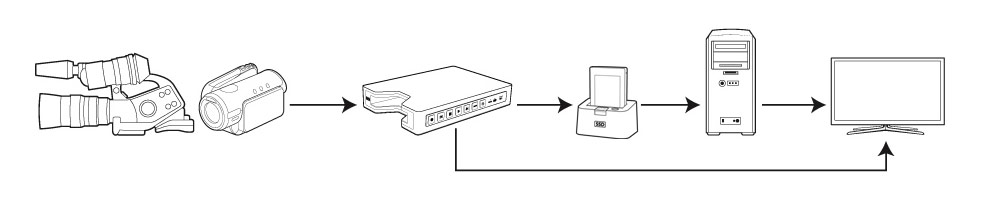 Um Material vom Hyperdeck Shuttle 2 zur Nachbearbeitung auf ein Schnittsystem übertragen, wird eine separate SATA-Docking-Station benötigt. Die SSD muss also zunächst aus dem Hyperdeck-Recorder herausgezogen und in einen Adapter gesteckt werden, mit dem die SSD von einem Computer als externes Laufwerk erkannt wird.