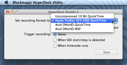 Zur Konfiguration muss das Hyperdeck deshalb über eine USB-Verbindung an einen Rechner angeschlossen werden, auf dem die Software Hyperdeck Utility installiert ist. Damit ässt sich dann einstellen, welches Aufnahmeformat benutzt werden soll: Unkomprimiertes Quicktime-MOV, Apple ProRes 422 HQ oder Avid DNxHD mit wahlweise MOV- oder MXF-Container. Ändert man die Codec-Einstellungen, wird der Recorder von der Software neu gestartet und entsprechend eingestellt. Der Reboot-Vorgang zum Ändern des Aufnahme-Codecs dauert rund zwei Minuten. Während dieser Zeit darf die USB-Verbindung zwischen Hyperdeck und Rechner nicht unterbrochen werden.