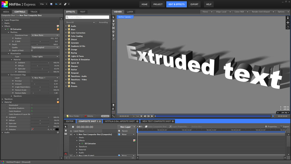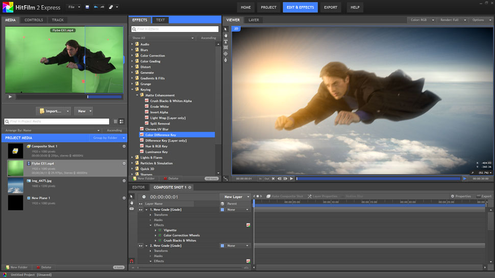 Interessant wird Hitfilm 2 Express durch die Integration einer ebenen-basierten Compositing-Umgebung, die sich direkt aus der Editing-Timeline heraus öffnen lässt. Mit den verfügbaren Tools können hier dann 2D- wie auch 3D-Compositings erstellt werden. Es stehen zum Beispiel Werkzeuge für das Keying, die Maskierung und die Keyframe-Animation von Ebenen zur Verfügung. Auch ein 2D-Feature-Tracker ist integriert. Für das 3D-Compositing können Kameras und Lichter erzeugt werden. Ebenfalls möglich ist das Erstellen von 3D-Text.