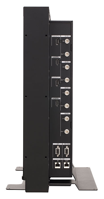 Anschlussseitig kommt der Monitor mit 4 x 3G-SDI / HD-SDI-Inputs. Die angeschlossenen SDI-Signale können an 4 Loop-Through-Ausgängen unverändert abgegriffen werden. Weiter besitzt der Monitor zwei HDMI– sowie zwei Display-Port-Eingänge.
