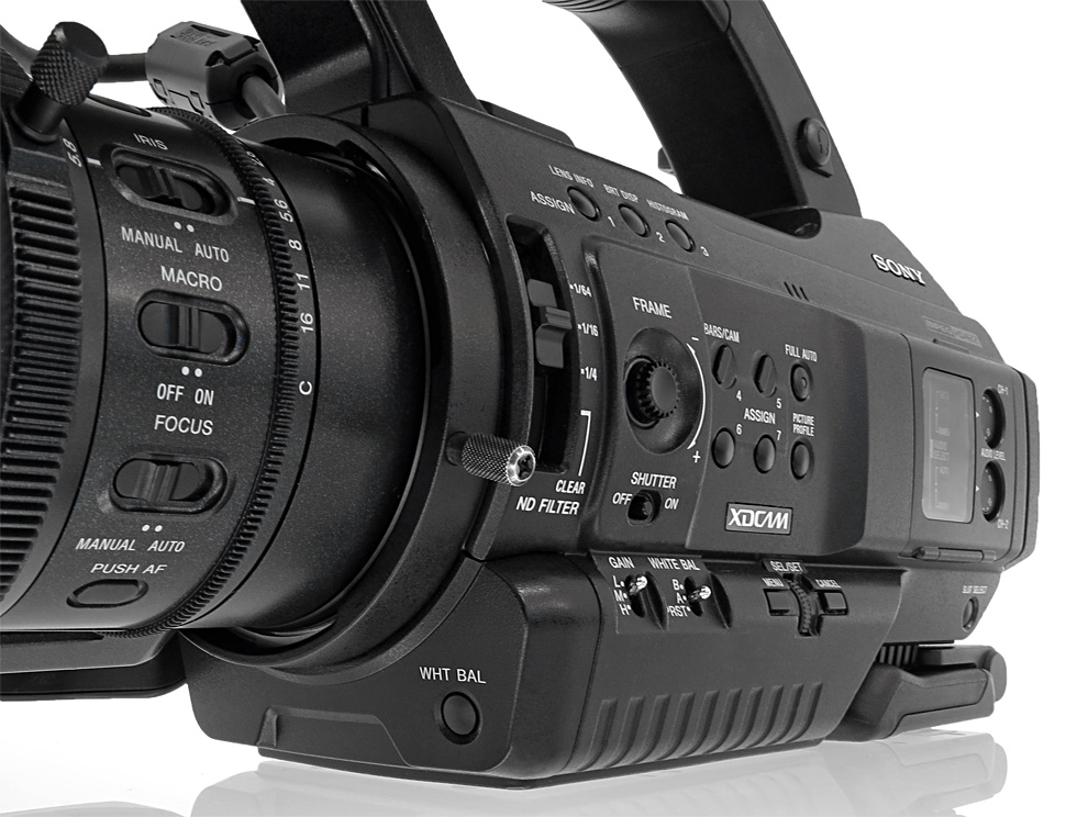 Grundsätzlich gestaltet sich die Bedienung des PMW-300 intuitiv und unkompliziert. Ist man mit anderen Camcorder-Modellen von Sony bereits vertraut, kann man auch mit dem PMW-300 sofort und ohne Umstellung loslegen. Die wichtigsten Tasten und Schalter für Gerätesteuerung und Setup befinden sich an der linken Gehäuseseite. Weißabgleich und Verstärkung lassen sich schnell und übersichtlich mit zwei kleinen Kippschaltern setzen. Auch die Bedienung des 3-stufigen ND-Filters (1/4 ND, 1/16 ND, 1/64 ND) ist selbsterklärend: Über einen Schieber, der ebenfalls an der linken Seite des Camcorders angebracht ist, werden die Filter mechanisch in den Strahlengang zwischen Optik und Sensor geschwenkt. Das manuelle Pegeln der Audiosignale ist ebenfalls an der Seite möglich, so wie man das von anderen Handhelds oder auch Schultercamcordern her kennt.