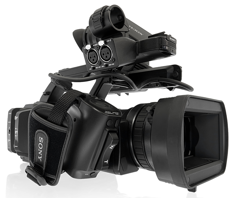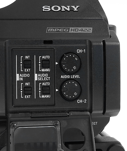 Für die Aufzeichnung von externen Audiosignalen stehen am Henkel des PMW-300 zwei XLR-Buchsen zur Verfügung. Hier lassen sich Mikrofone mit Phantomspeisung genauso anschließen wie Line-Quellen. Abgehört werden können Stereo-Tonsignale über eine 3.5 mm-Kopfhörerbuchse sowie einen Stereo-Cinch-Anschluss an der Gehäuserückseite.