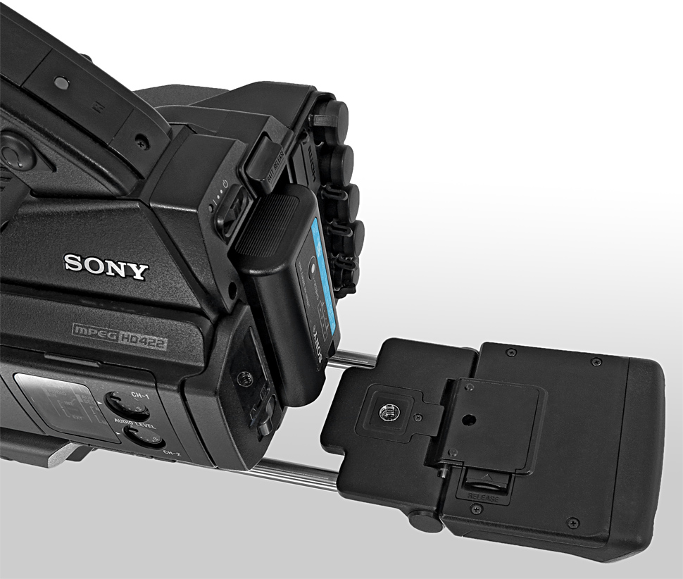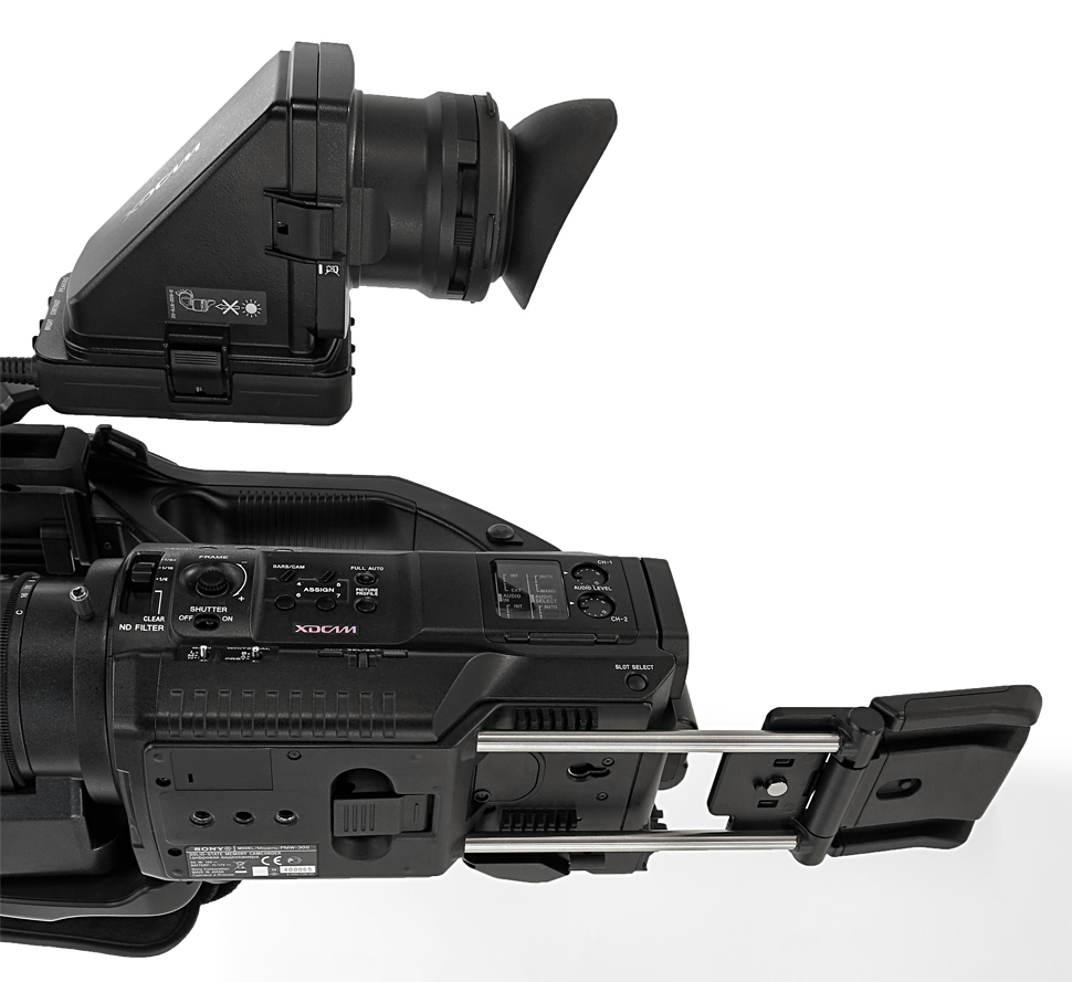 In die Kategorie Semi-Schultercamcorder lässt sich der PMW-300 aber auch schlicht wegen seiner ausklappbaren Schulterstütze einordnen. Diese befindet sich gut »getarnt« unterhalb des Camcorder-Gehäuses. Sie besteht aus einem kleinen, gummierten Schulterpolster, das über einen Schiebehebel entriegelt und dann umgeklappt werden kann. Um das Schulterpolster im gewünschten Abstand zum Camcorder-Body positionieren zu können, ist es wiederum an zwei Rohren befestigt. Diese lassen sich nach dem Öffnen einer Klemme aus der Bodenplatte des Camcorders herausziehen – auf diesem Wege wird der PMW-300 für den Schulterbetrieb ausbalanciert und eingerichtet.