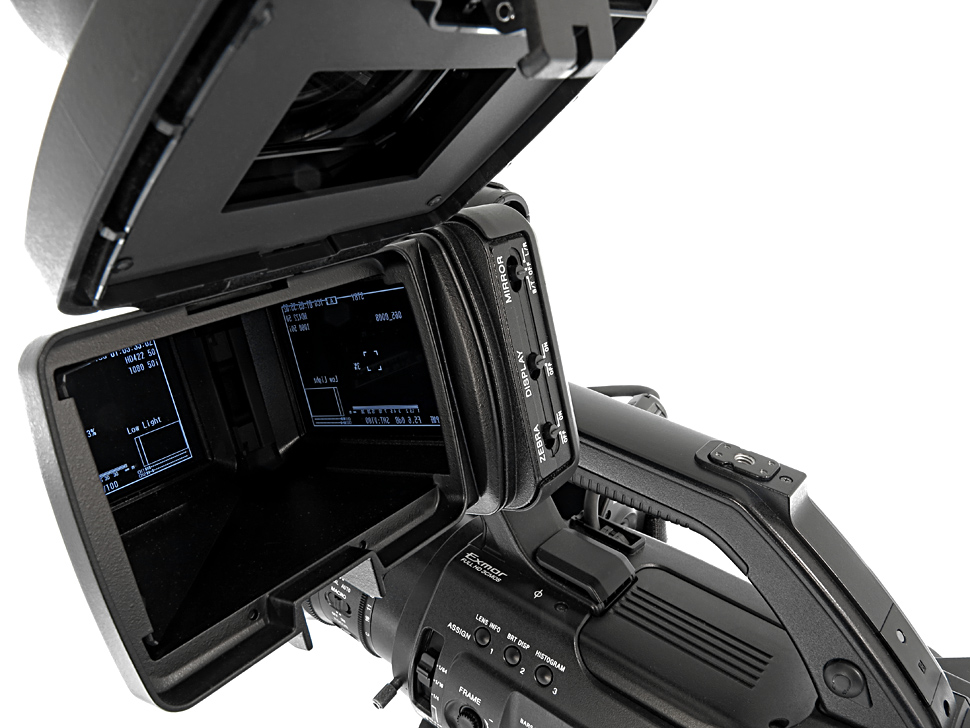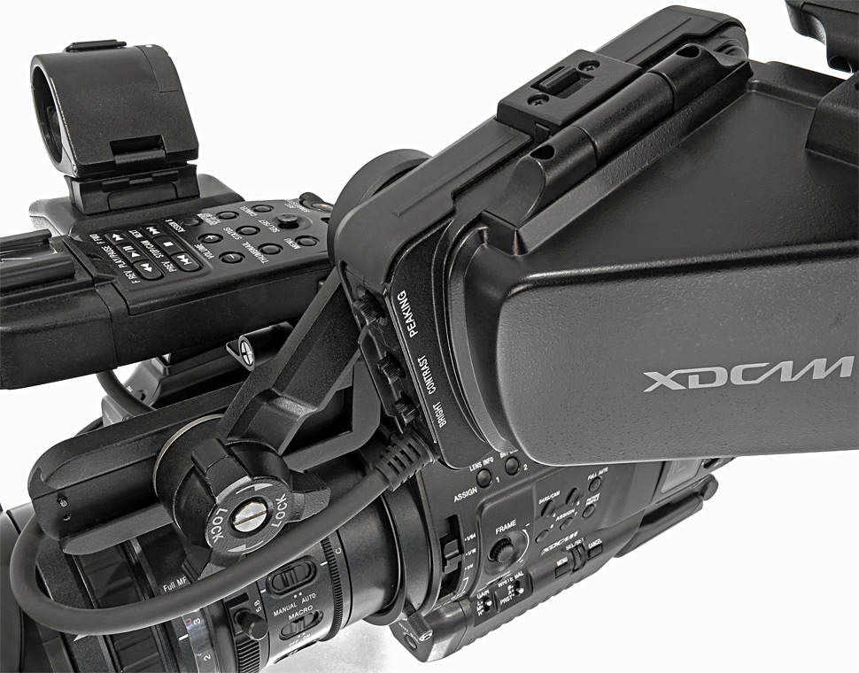 Auf den ersten Blick fällt beim PMW-300 die voluminöse Sucherkonstruktion auf. Dabei handelt es sich um ein Display mit einem vorgesetzten Winkelsucher mit Spiegel, an dem wiederum ein Okular befestigt ist. Winkelsucher und Okular sind so konstruiert, dass sie bei Bedarf auch hochgeklappt oder komplett abgenommen werden können. Für das Display nutzt Sony beim PMW-300 ein Farb-LCD mit 3,5-Zoll und einer Auflösung von 960 x 540 Bildpunkten. Das Display ist seitlich an einem Ausleger befestigt, durch den die gesamte Sucherkonstruktion in ihrer Position flexibel einstellbar wird. Zudem lässt sich die komplette Kombination aus Display und aufgesetztem Sucher auch vollständig abmontieren. Für einen solchen Fall nutzt Sony eine spezielle Steckverbindung zwischen Display-Kabel und Camcorder, die bei Bedarf einfach getrennt werden kann.