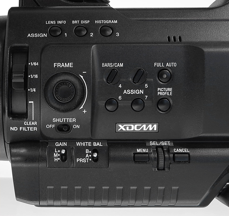 Positiv: Viele Funktionen können beim PMW-300 direkt per Taste ausgewählt werden, ohne dass man dafür extra ins Menü gehen muss. So stehen acht Funktionstasten (Assign Buttons) zur Verfügung, die sich individuell mit diversen Camcorder-Funktionen belegen lassen. Über die Assign Buttons können zum Beispiel Funktionen wie die Histogramm-Darstellung oder das Cache-Recording sehr schnell ein- und ausgeschaltet werden. Für Aufnahmesituationen, in denen es sehr schnell gehen muss, ist auch ein Full Auto-Modus vorhanden – der sich ebenfalls über eine speziell vorhandene Taste schnell aktivieren lässt. Ebenfalls sinnvoll ist die Picture Profile-Taste, um direkt zwischen verschiedenen, zuvor gespeicherten Bildprofilen wechseln zu können.