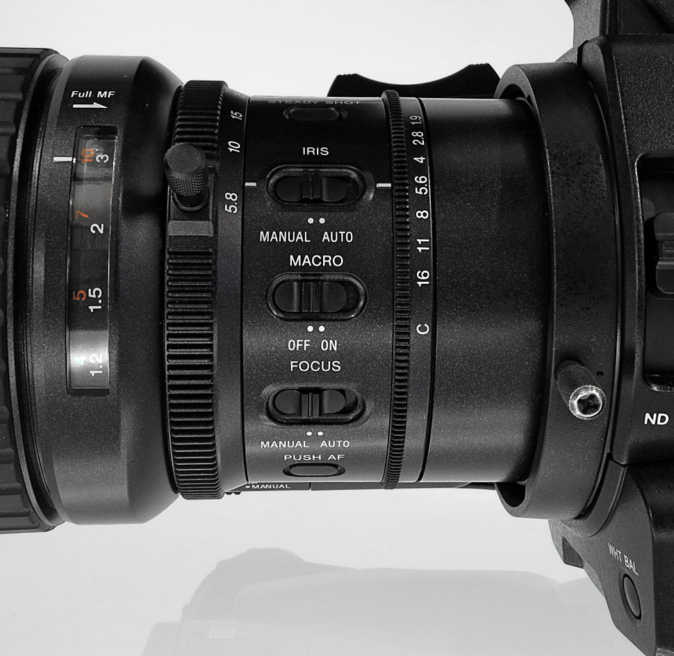 Wie Eingangs erwähnt, wird der PMW-300 in der hier getesteten Variante (PMW-300K1) mit einem 14-fach Zoom von Fujinon geliefert, das einen Kleinbild-Brennweitenbereich von 31.4 bis 439 mm abdeckt und eine durchgehende, maximale Blendenöffnung von F1.9 besitzt. Die Optik bietet separate Bedienringe für Fokus, Zoom und Blende. Ein optischer Bildstabilisator ist ebenfalls integriert. Die technischen Eckdaten gleichen somit den Objektiven, die Sony bereits beim PMW-200 oder auch beim PMW-EX1 oder PMW-EX3 eingesetzt hat.