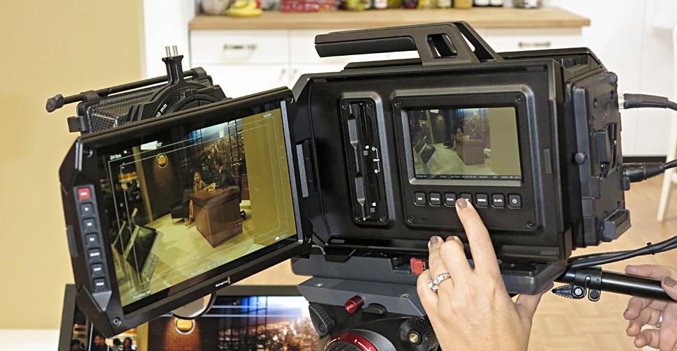 Neben einem großen ausklappbaren 10-Zoll-Display bietet die Kamera auf jeder Seite ein weiteres Display, auf dem das Einstellmenü sowie ein Kontrollmenü für Blende, Fokus, Audiopegel abgelesen werden können.
