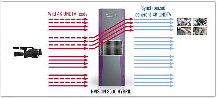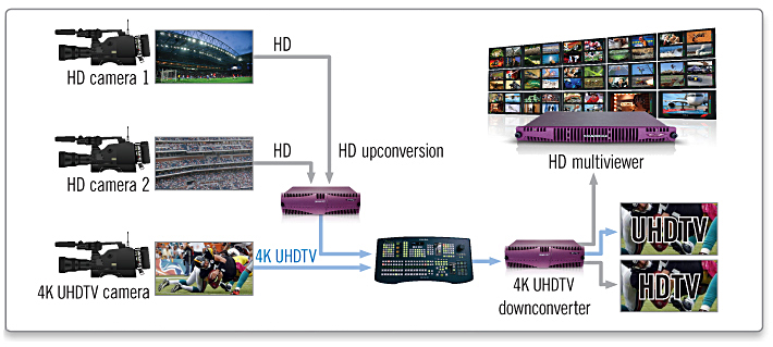 Den Videoprozessor K-Frame, der die Hard- und Software-Basis der Videomischer Kayenne und Karrera bildet, hat Grass Valley 4K-fähig gemacht. Damit sind mit den GV-Mischern 4K-Produktionen möglich und das Herz der 4K-Live-Produktion schlägt auch bei Grass Valley. Bildgenaues 4K-Routing ist mit der Kreuzschiene Nvision 8500 möglich. Auch das Replay-System K2 Dyno ist 4K-fähig und kann auch für optionales HD-Pannning und -Zooming genutzt werden, also um aus dem 4K-Bild auch ein HD-Signal generieren zu können. Multiviewer der Kaleido-Baureihe gibt es ebenfalls mit 4K-Fähigkeit.