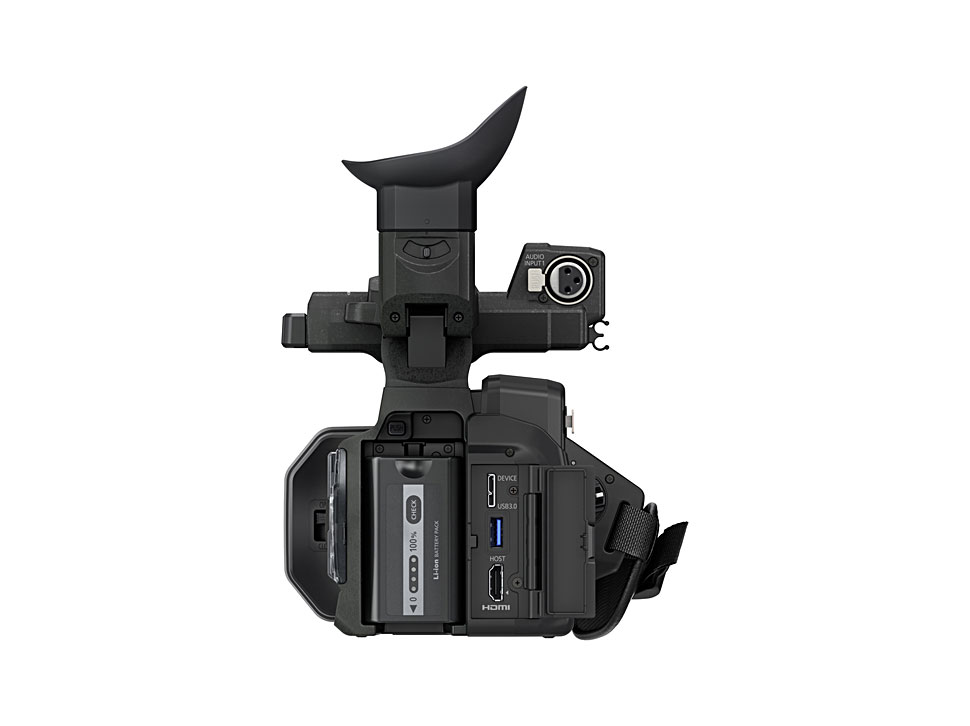 Für die Bildbeurteilung bietet der Camcorder einen Farbsucher mit 1,266 Mio. Bildpunkten und ein 8,89 cm-Display mit Touch-Bedienung. Wird das Touch-Panel nicht gebraucht, lässt es sich für mehr Mobilität und Sicherheit im Haltegriff versenken.