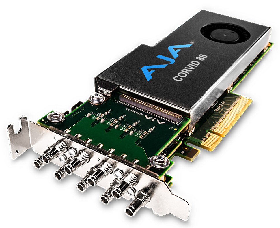 - Das Ein- und Ausspielen des 8K-60p-Materials erfolgt in Echtzeit über 16 3G-SDI-Schnittstellen, hinter denen PCIe-Karten des Typs Corvid 88 von AJA stehen, um die erforderliche Anzahl von Kanälen bewältigen zu können. Das auf der InterBEee vorgeführte System nutzte vier Corvid-88-Karten.
