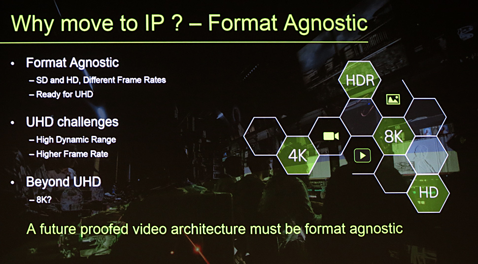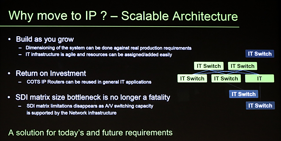 Über die Vorteile, die IP-Installationen mit sich bringen, gibt es umfassende Abhandlungen und Artikel, auch bei film-tv-video.de (etwa hier). Drei der wichtigsten Argumente für die Praxis liegen aber vielleicht darin: Über IP-Strukturen lassen sich Signale unterschiedlichster Formate und Auflösungen verteilen und es reduziert natürlich den Kabelaufwand dramatisch, wenn man sozusagen ein Multiplex-Signal verschickt. Außerdem kann IP-Equipment wesentlich kleiner, kompakter und energiesparender realisiert werden als SDI-Equipment. Außerdem sind die Kosten für einzelne Komponenten dramatisch niedriger, wie besonders am Vergleich des Preises einer SDI-Kreuzschiene zu einem IP-Router deutlich wird.